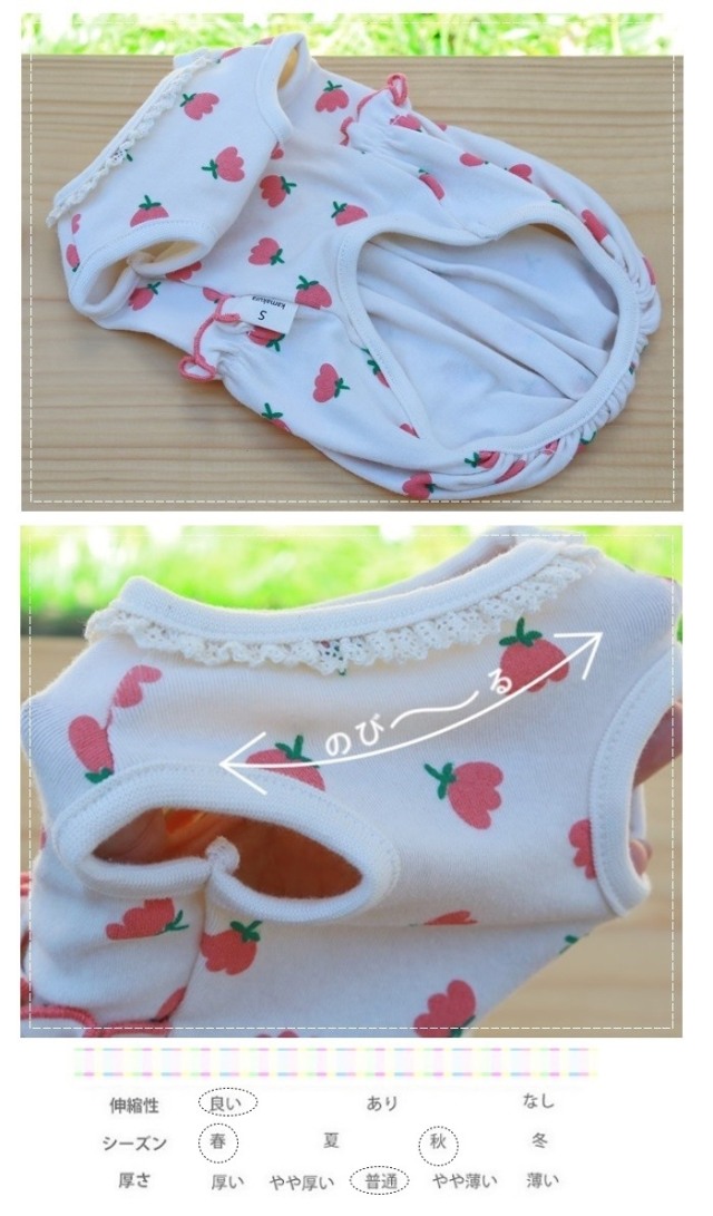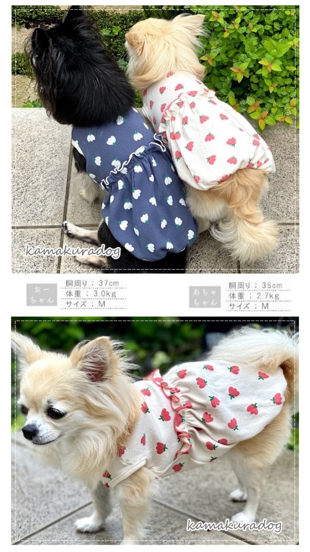 洋服のデザイン、また愛犬の個体差や毛量によって若干サイズが異なる場合がございますので、事前にワンちゃんのサイズを測った上でご検討下さい。