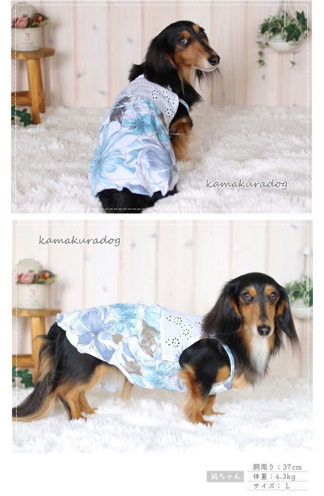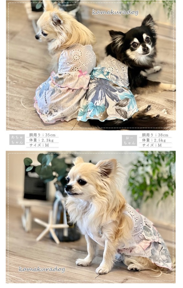 洋服のデザイン、また愛犬の個体差や毛量によって若干サイズが異なる場合がございますので、事前にワンちゃんのサイズを測った上でご検討下さい。
