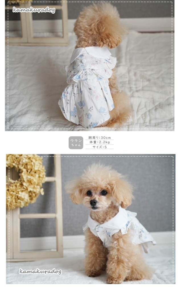 洋服のデザイン、また愛犬の個体差や毛量によって若干サイズが異なる場合がございますので、事前にワンちゃんのサイズを測った上でご検討下さい。
