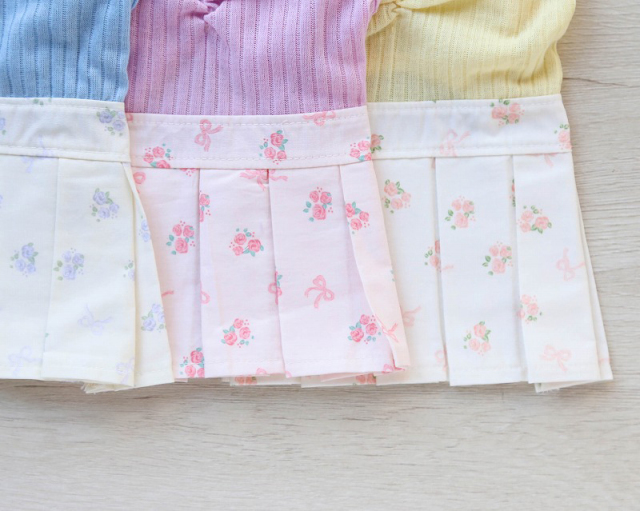 スカート部分には可憐な小花柄のプリーツデザイン。動くたびにふわっと揺れて、後ろ姿までしっかり可愛い一着です。